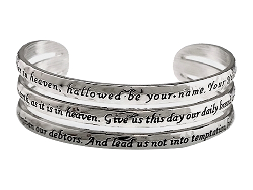 This is a very nice Lord's Prayer cuff bracelet finished in a polished silver tone. Has a 3 bar design with center cutouts. The 3 bars have the entire Lord's Prayer inscribed throughout. Makes a great gift for that friend or family member that needs some encouragement, comes in a nice gift box.