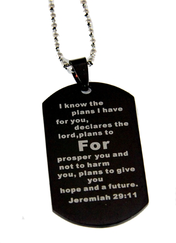 Jeremiah 29:11, For I know the plans I have for you, declares the Lord, plans to prosper you and not to harm you, plans to give you hope and a future. Comes with a 20 inch ball chain and a nice gift box. Makes an excellent gift for a friend or loved one struggling with their faith or needs encouragement.
