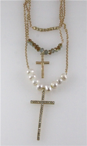 This is a spectacular 3 strand stacking necklace that features a necklace with gold tone beads, a necklace with faux turquoise beads with a 1 inch Cross and a necklaces with faux pearls and a 2 inch Cross fill with sparkling clear CZ stones. All finished in a brushed gold plating. The chains stagger at 16", 18" and 20" Comes in a beautiful satin lined gift box with a satin ribbon and bow, no wrapping required.